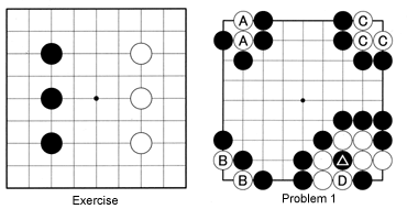 Problem 1: In problems A through C, where should Black play to capture a few stones in each case. In situation D, Black played the marked stone and White captured it with D. Where should Black play next?
