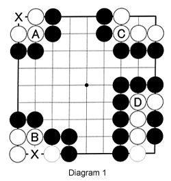 Diagram 1: You could offer situations like those at A through D. Ask how many liberties each white group has and how many moves it would take to capture each group. The student might say, "It's suicide if Black plays at the X spots." You can then place a finger on those spots, and explain that if a black stone is placed there, the white stones around A (or B) have no liberties left. Give the student time to understand this and then place black stones on the X spots. Now you should ask whether those black stones are without liberties and should be removed from the board. After that, ask what moves Black should make in regard to the C and D groups.