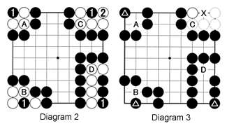 Diagram 2: In situations A, B and D, black 1 removes White's last liberty. But in situation C, White may counter with 2. What will happen next?