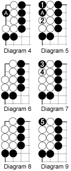 Diagram 9: However, black 5 seals White's fate. This move takes away White's last liberty and captures all seven stones. This shows that White's stones in Diagram 4 were already lost.
