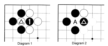 Diagram 1: The marked stone is in atari, i.e. it is down to one liberty. Therefore, Black can capture it by playing at 1.