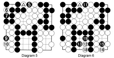 Diagram 5 (white 8 is not shown): Black captures the marked white stone with 5. White then plays a ko threat with 6, which is answered by black 7. Since the board situation has changed again, White can now play at 8 (where the marked stone is). Black must now make a ko threat at 9, which will be answered by White 10.