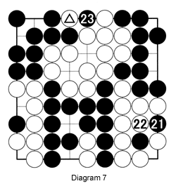 Diagram 7 (Black 25 is not shown): Black plays his last ko threat at 21. White must defend with 22. Black captures the ko with 23 but White now has no ko threat and must pass. Black can then connect with 25 at the spot where the marked white stone was taken. Now count again. After removing all the dead stones, you will find Black has 9 points in territory while he captured 3 stones plus 4 in the ko, a total of 16 points. White has 8 points in territory, captured 4 stones plus 4 in the ko, which also works out to 16 points. Therefore, the score is even and Black has avoided a loss. Incidentally, in go a draw is called "igo."