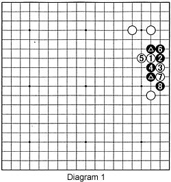 Diagram 1: Last week, we briefly looked at Black's two-space extension. This extension on the third line cannot be cut, even if surrounded by White stones such as here. For example, White can try attaching at 1 and cutting with 3, but black 2 through 6 do the job. Black is connected even if White plays at 7. Black 8 bottles up two stones and keeps them down to two liberties. Verify these two white stones cannot escape. This extension is a good position to do some sparring if you have a partner or teacher.
