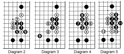 Diagram 3: White 2 is answered with 3 through 7, which paralyzes White's upper marked stone. After black 9, White's stones are virtually dead.