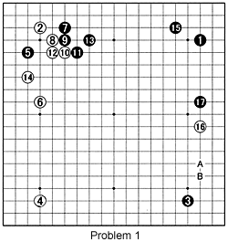 Problem 1: To avoid being pincered too severely, instead of approaching at A or B, White opted for 16. Black responded with 17. Why didn't Black play at A or B, instead of 17, to make a shimari (two-stone corner enclosure)? Should White now extend to A or B? If so, why?