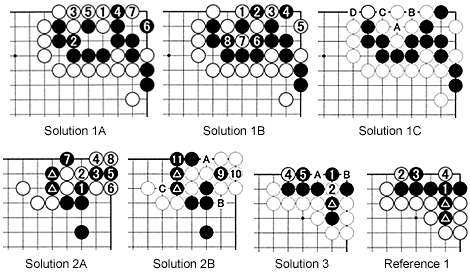 Solution 1B: At first sight, white 1 seems to be the only reasonable move. However, black 2 is a tenacious response. Whatever White does, he cannot avoid a ko.