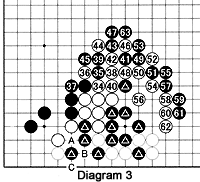 Diagram 3: ...of course, White tries to fight his way out. After black 41, he can capture Black once more with A, black B, white C, but that gives a bad result. Therefore, he goes on and finally escapes with the sequence through 56. Black forces the sequence 57 through 62, then defends with 63. All of Black's marked stones are dead, and White has about 40 points in territory, but Black's thickness is overwhelming. Black has shown detachment in regard to his stones and treated them lightly, while White indicated he was attached to the idea of capturing Black's stones. Needless to say, Black will win this game.