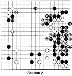 Solution 2: In response to black 1, in the actual game, White played 2. Black 3 was a clever move that led to the sequence through 22, where Black is connected underneath with 15 while White makes life with 22. References 1, 2 and 3 show that this result is inevitable. After this, Black's group is in danger so he reinforces with 23 through 29, while White does the same through 32. With Black slightly leading, White starts a new fight with 36.