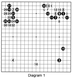 Diagram 1: In this game between Hideyuki Sakai and Rin Kono, a group is sacrificed unexpectedly, leading to something even more unexpected. Last week, we looked at a shape similar to the one at the top right where the cut at A was the focal point. If White cuts at A after black 13, Black will follow the sequence shown in Reference 1. After 14, White threatens to cut at A. But now the stones at 1 and 9 have fulfilled their duty, so if White cuts, Black will play at B, followed by white C and black D, sacrificing three stones as we discussed last week. Black 15 is in line with that strategy. Black 17 puts pressure on the corner while protecting against the cut at A and other threats in this area. With 18, White initiates a joseki (standard corner exchange) but deviates with 28, leading to the sequence through 32. A problem arises when Black attaches with 33. How should White respond? If he plays at E or F, Black secures a large territory with G and White's corner is still in jeopardy.