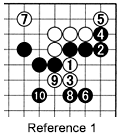 Reference 1: If White cuts after black 13, Black descends with 2. After 6, White must defend his corner with 7. However, he then loses the initiative in the center and, in the worst case, has to deal with the sequence 8 through 10.