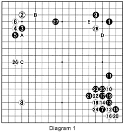 Diagram 1: Approaching with 3 and turning to the empty corner with 7 is one of Cho's trademarks. He treats 3 and 5 lightly and is prepared to sacrifice these stones at the drop of a hat. In the meanwhile, he plans to build up the right side. White 26 prevents Black from playing out the joseki black A, white B and black C, while threatening to cut at A. However, in line with his earlier strategy, Black ignores this threat and expands to 27. White then invades at 28. How should Black defend against this intrusion? Should he defend the right with D or the top with E? What would you do and why?