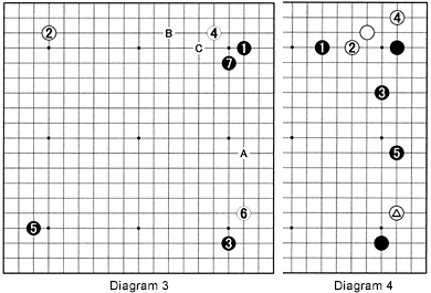 Diagram 3: The moves through 7 form a strategy devised by Honinbo Shusaku (1829-62), one of the game's greatest players. His unparalleled record of 19 straight wins in the so-called castle games at the shogun's castle earned him the nickname Invincible Shusaku. While preventing a White move there, black 7 sets up A, B and C. However, this was before the introduction of the komi system. After komi was adopted--initially 4.5 points--7 was considered a slow move.