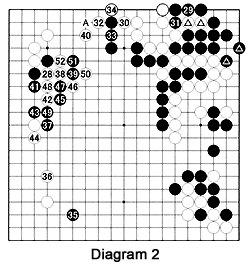 After 52 in Diagram 2, can White avoid being cut off? Can Black take the center? Ponder these questions before we continue the game next week.