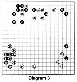 Diagram 3: Last week, we discussed the basics of the Shusaku opening and learned the kosumi (diagonal play) formation of 2 and 6 was good for Black in the days before komi. Answering 5 with 6 for White has long been considered too slow. However, after the komi increased to 6.5 points, strategies hitherto thought too passive widened White's range of options. In this game played in the LG cup in 2004 against Choi Cheol Han, Kong Jie responds with 6, setting up an interesting framework strategy at the bottom, and goes on to win the game comfortably.