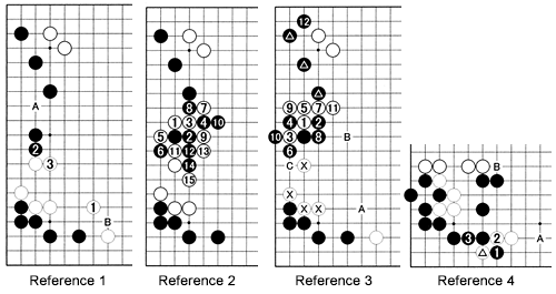 Reference 2: In response to White's attachment, black 2 looks like the right move, but Black cannot cut at 8 after white 7. White 9 through 15 set up a ladder that captures Black's stones.