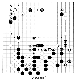 Diagram 1 (1-22 represent moves 59-90): Let us continue last week's game between two top pros. White's marked stones, which were played last week, appear to be in trouble. However, Black ignores them. Instead, he plays at 1 to prevent White from making a corner enclosure. After 2, Black would usually play at A, followed by white B, black 8, white C and black D or E. But at this point, the top is more valuable than the left side--just imagine a white move at F. That is why black 3, white 4 and black 5 are natural moves. White 6 and 8 are strong moves. Black 9 seems to make few points, but it supports Black's stones at top left and isolates White's center group. A move at G would give White a similar situation. White 10 and 12 are a natural defense, but black 11 is not. Black J would have been a weak move. Note that after 11, white H would be met with black I, followed by white J and black K. White 14 is an intuitive move. But if this stone dies, points would be lost. After 17, white 16 is dead (see References 1 and 2). However, White 20 and 22 are a great combination. Can you see how this works together with White's possibilities in the corner? How should Black respond?
