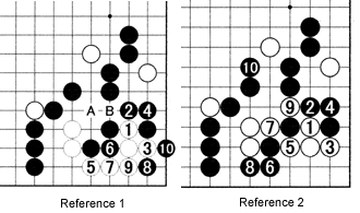 Reference 1: If White tries to remain alive with 1, 3 and 5, black 6 and 8 are a good combination to counter this. After 10, White's corner group is dead. However, keep in mind Black must answer white A at B.