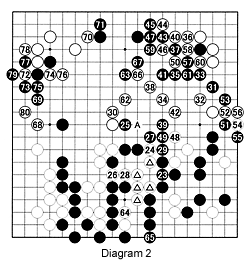 Diagram 2 (23-80 represent moves 91-148): Having to play at 23 is a terrible setback for Black, but he had no choice (see Reference 3). Probably still flustered, Black then makes a fatal mistake by playing at 25. Reference 4 explains why he should have played at A to remain in the game. With 26 and 28, White connects his marked stones, while Black is handicapped with a cut at 29. Black tries to turn things around with 31, but White keeps his lead by playing solidly in the center. White is leading in territory and Black desperately tries to turn the tables, but Black's stones around 69 finally die. The real cause for Black's loss can be found in black 25. The moves after 80 are not shown.