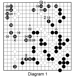 Diagram 1 (1-34 represent moves 75-108): Black 1 kills the marked white stone and prepares for an interesting invasion technique of 11 through 19. After this combination, Black can still aim at starting a ko with A, so White's territory at the top is not as extensive as it seems after white 22. Black 5 aims at ensuring life on the left side by using the aji (potential) of his marked stone in combination with 23 through 29. If this group survives without problems, Black is ahead (see Reference 1). However, White strikes with 30, 32 and 34, completely confusing the issue. This was White's intention all along when he played at 20 and 22. In retrospect, after 10 Black should have played around A.