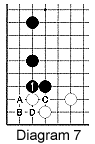 Diagram 7: Because White did not answer at C in Diagram 6, Black 1 becomes a good move. This move can be followed by the sequence black A, white B, black C and white D, putting White in an even lower position. Now what do you think about Diagram 4?