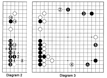 Diagram 2: Notice that White has used two stones more than Black. Therefore, the result on the left side is not even. Now let us see how we got to this position by reversing moves so we can arrive at a common position. The moves through 8 are a joseki. However, black 9 is not. Instead, let's say Black plays at A or B. The exchange 10 for 11 and 12 for 13 are slightly disadvantageous for White. Black 15 is not a move that has to be played at this time, but it is not worthless. On the other hand, white 14 is a good move but white 16 seems a little slow. In short, we have to evaluate the 15 for 16 exchange. This is slightly favorable for White. However, the analysis does not end there.
