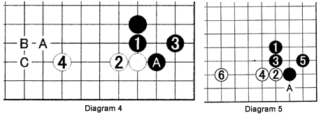 Diagram 4: For some, not answering black A is inconceivable. What happens when White plays elsewhere? Black plays at 1 and 3, while White makes a base with 2 and 4. Instead of 4, White can also play at A, or in special cases at B or C.