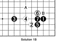 Solution 1B: That is why after 6, Black must not play at B. Instead, 7 is the vital point to attack White's eye-shape. White can now follow up with A or B, but either way, he does not get a good result. Therefore, white 6 can be viewed as a trick move.