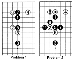 Problem 1: The moves through 5 are a standard sequence. In the past few years, many joseki have been questioned, giving rise to new moves. One development was to play at 6 before playing hane (diagonal connecting move) at 8. How should Black answer this move?