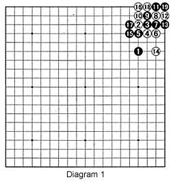 Diagram 1: Not too long ago, this sequence used to be considered a joseki (standard local exchange) with both White and Black even. After black 19, White still has to add a move, but by doing so he will capture six black stones. How to you feel about this? Do you feel this result is bad for Black because he lost six stones?