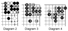 Diagram 2: After white 20, the six black stones are dead. Black now has the option of blocking off at A. White would not be able to resist playing at B, but this would be followed by the sequence black C, white D, black E, white F, with Black taking the corner with G. However, for the sake of argument, let's say Black exchanges 21 and 23 for 22 and 24. This gives White the corner with about 12 points (remember Black captured two stones there) while Black gains great influence to the left, certainly worth more than 12 points. However, even if we don't think in terms of points, we can still establish why this gives White a bad result.