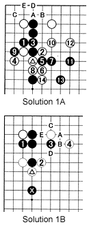 Solution 1A: In this game between Yoo Chang Hyuk (Black) and O Meien, both top pros, the following pattern appeared after White played the marked stone. Note, White's stone in the corner is not dead yet; White can play at A, followed by black B, white C, black D and white E, which starts a ko.
