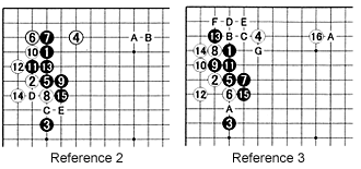 Reference 2: In response to 8, Black must not oblige with 9. The moves through 15 would be inevitable, followed by a white move at A or B. Black can force C for white D, but is still left with a cutting point at E. Although all of his moves seem natural, Black ends up with an inferior result.