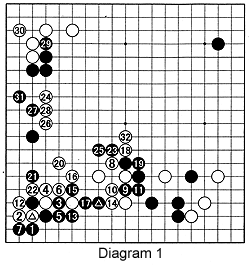 Diagram 1: We will now continue the game we started last week between titleholder Keigo Yamashita and challenger Kobayashi Satoru (Black) in the 41st Kisei title match.