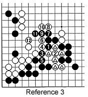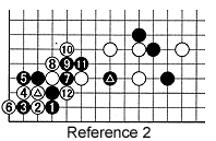 Reference 2: The moves 7 and 9 initiate a relatively new joseki that becomes complicated when White cuts with 12. This will lead to a tough battle. However, the bottom line is that Black's marked stone is not exactly in the correct spot, meaning this will almost certainly be a lost move.
