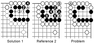 Black 1 was the concluding move last time. White 2 defends in sente against the cut at A and black 3 against the one at B. After the sequence through 14, White's group seems alive. Black, however, has a trick up his sleeve when he plays at 15. He wanted to play at 19, but he got the order wrong. Instead, he should have followed Reference 1. He could have used 15 and 17 as ko threats, but since he played them prematurely, White is able to resist with 20 and fight a ko on less unfavorable terms. Black has a good ko threat at 29, but it is not nearly as good as one at 15, but he had already shot his wad.