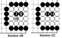 Solution 2C: After the two black stones are removed, Black comes back once again at 11. This time it is meaningless for White to capture this stone (try this on the board). However, Black can capture the white group on his next turn at 13. Now count all the moves Black and White made and you will find Black needed seven moves against White's two. In other words, Black used five more moves to capture the white group.