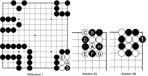 Solution 2B: So black 1 is the correct move. Take the stones off the board and check that all of Black's stones are safe now.