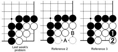 Reference 3: This is the situation after White has captured the black stone. Now Black cannot play at A or B, because neither of these moves takes away White's last liberty. A black stone at A or B cannot exist as it would be without liberties and such a "suicidal" play is prohibited in the rules of go. Compare this with situation D in Solution 1.