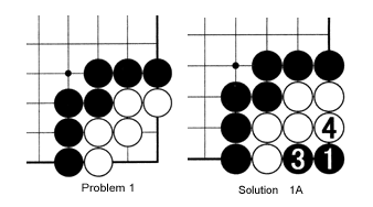 Solution 1A: Black 1 is the vital point. White cannot play at 3 or 4 since he would lose one of his own liberties. Therefore, he plays elsewhere. Although White's stones are lost, if Black insists on actually capturing his opponent's stones, he can do so by playing at 3. White is left with one liberty, but so is Black. White can capture two stones with 4. What happens next?