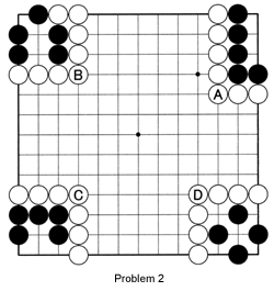 Problem 2: These problems are similar to problem 1, especially problem A. In each case, where should Black play if it were his turn? If it were White's turn, where should he move?