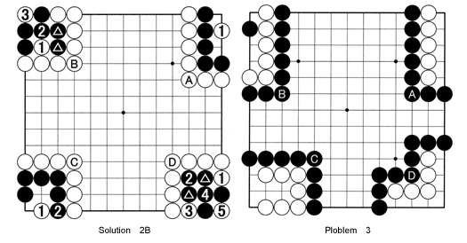 Problem 3: In problems A through D, where should Black play to kill White? On the other hand, if it were White's move, where should he play to stay alive? The answers to these problems will be given next week.