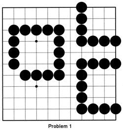 Problem 1: Here are three examples relating to territory. In each case, Black has surrounded nine points of territory. However, in each case the number of stones is different. How many stones did Black use in each case to establish his territory? Which formation is most efficient?