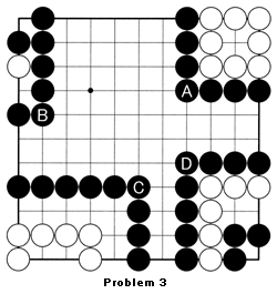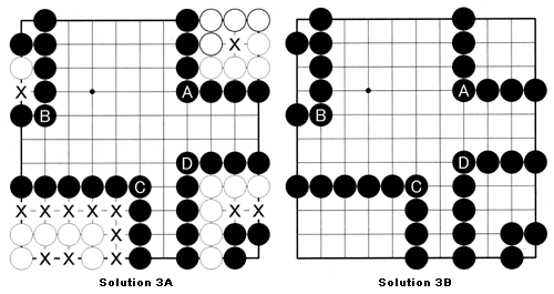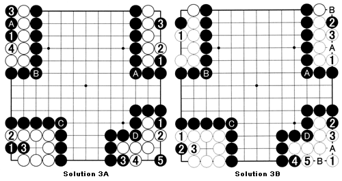 Solution 3B: In case A, White makes his space as large as possible by playing at 1. Even if Black plays at 2, White plays at 3 to make two eyes. As you can see, Black cannot play at A or B so White is alive. In case B, White plays at 1 and makes two eyes and is alive.
