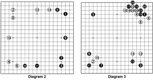 Diagram 2: After playing the same moves through 11, White could play at 12. This, of course, is of equal importance to 11. Black can now limit the influence radiating from White's lower left corner by playing at 13. However, with 14, White can do the same. The result up to this point is even. That is bad news for Black because he has to give 6.5 komi to White.