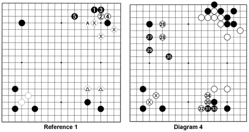 Diagram 4: White keeps expanding his center with 26 through 34. Black's next move is very instructive. Black 35 keeps in check White's center framework while also isolating White's marked stones. Although 35 does not make any territory in itself, it destroys White's territory while aiming at an attack.