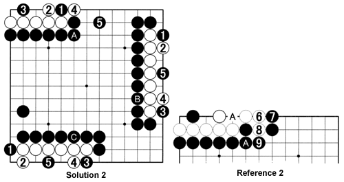 Solution 2: In each of the cases A, B and C, Black limits White's eye-space and then strikes at the vital point to prevent White from making two eyes. See Reference 2 if you are wondering what happens after white 4 in group A.