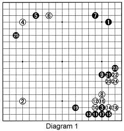 As you can see, the four corners are divided evenly in the first four moves. Let us say these moves each are worth around eight points. Black plays at 5 in the hope of bringing about a development as seen in Reference 1. White 6 counters this. Black 7 aims at monopolizing the right side, but white 8 stops this. Black 9 has multiple functions. First, it attacks by preventing White from making a base. Second, it prevents White from making territory in this area. Third, it is an extension from the top right and makes territory on the right side. This is surely the most valuable move played so far because it has more than one role. This move could easily be worth 20 points. The moves through 17 are joseki (standard moves). Both players aim at making a base here while preventing the opponent from doing so. These moves cannot be evaluated one by one--they should be seen as a combination. According to the QARTS system (Quantitative Analysis of Relative Territory and Strength), a weak group is a liability with a value of minus 20 points. A weak group with one certain eye has a value of minus 10 points, while groups with eyes are worth the value of their territory. In that sense, every move in this area has two purposes: One is to make a base or eyes and the other is to take a base and eyes away from the opponent. In this sense, each move is then worth 20 points+20 points=40 points. However, White and Black play such moves in turn, so they balance each other out. The result up to 24 is that White has a living group with territory of about 10 points and Black has a living group of about six points plus a few stones on the right that aim at annexing the right side. However, they can turn into a weak group. At this moment, the left side looks wider so Black plays at 25.