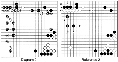Diagram 2: At this point, it is important for White to split the marked black stones. Black cannot look after both stones. Black 35 is a superb move. The aim is not to rescue the marked stone, but to eliminate White's potential here (see Reference 2). Destabilizing Black while making territory, white 36 is a great move. Again 37 is a light move--Black is not trying to make a base here. White 38 gains territory that is probably worth around 20 points. Sacrificing his marked stone, Black's real aim is developing the top right with 41 and 45. Note that 37, 39 and 43 contribute to Black's center development. White now has to invade in the top right and 46 through 50 are one way of doing that.