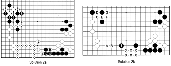 Solution 2a: White should play at 1. This move has multiple purposes. First, it is an extension from the lower left. Second, it threatens to cut through with the sequence white A, black B, white C, black D and white E. If Black defends with the sequence 2 through 8 as in the game, White strikes with 9 through 13, the third raison d'etre for white 1. After this combination, White has built up a tremendous framework around the marked area, while Black's group in the lower right is still without two eyes.